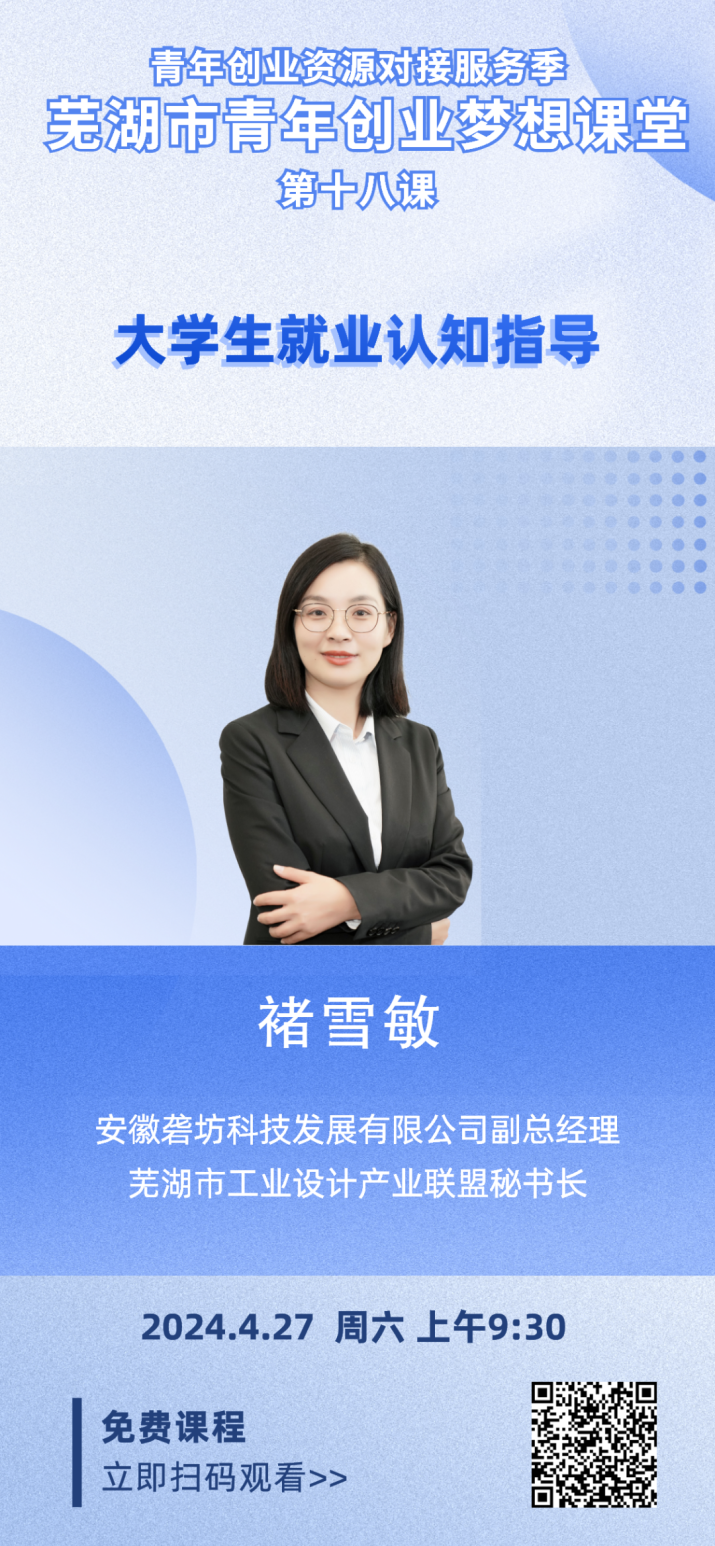 4月27日上午,“源來(lái)好創(chuàng)業(yè)”青年創(chuàng)業(yè)資源對(duì)接服務(wù)季——蕪湖市青年創(chuàng)業(yè)夢(mèng)想課堂第十八課正式播出。本次是由安徽礱坊科技發(fā)展有限公司副總經(jīng)理,蕪湖市工業(yè)設(shè)計(jì)產(chǎn)業(yè)聯(lián)盟秘書長(zhǎng)褚雪敏帶來(lái)的《大學(xué)生就業(yè)認(rèn)知指導(dǎo)》課程。